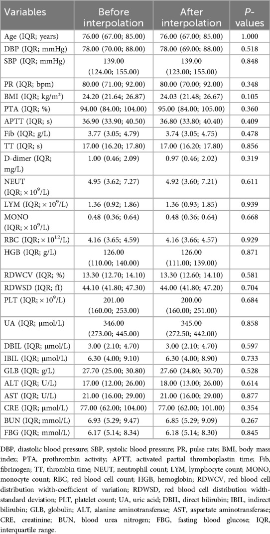 This study included a total of 3,113 hospitalized patients with CHD, among whom 474 had VTE (prevalence rate of 15.2%). The data were divided into a training set (N = 1,930), an internal validation set (N = 828), and a time-external validation set (N = 355). There was no statistically significant difference between the data before and after interpolation, as shown in Table 1.