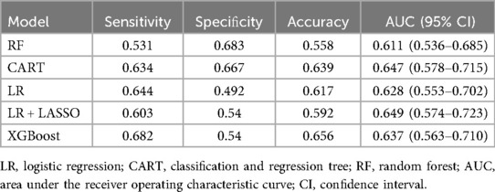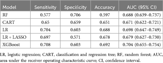 As shown in Table 3, in the internal validation set, XGBoost had the highest AUC (0.704), sensitivity (0.708), and accuracy (0.692), and RF had the highest specificity (0.706). In the time external validation set, LR + LASSO had the highest AUC (0.649), the highest specificity (0.683) for RF, and the highest sensitivity (0.682) and accuracy (0.656) for XGBoost (Table 4).