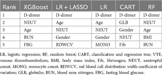 Previous VTE risk prediction models have also employed the five machine learning methods examined in this study. Among multiple models predicting VTE occurrence in intensive care units, RF demonstrated the best performance (38). In pediatric oncology studies, CART models successfully predicted VTE based on risk factors (39). In a prospective cohort study, researchers developed multiple VTE risk prediction models for patients with traumatic brain injury and found that LR performed better than other models (40). In a prognostic study of VTE in allogeneic transplant patients, LASSO was the optimal machine learning model (41). During the development and validation of machine learning models for predicting VTE in hospitalized cancer patients, the XGBoost model demonstrated superior performance compared with other machine learning approaches (42).