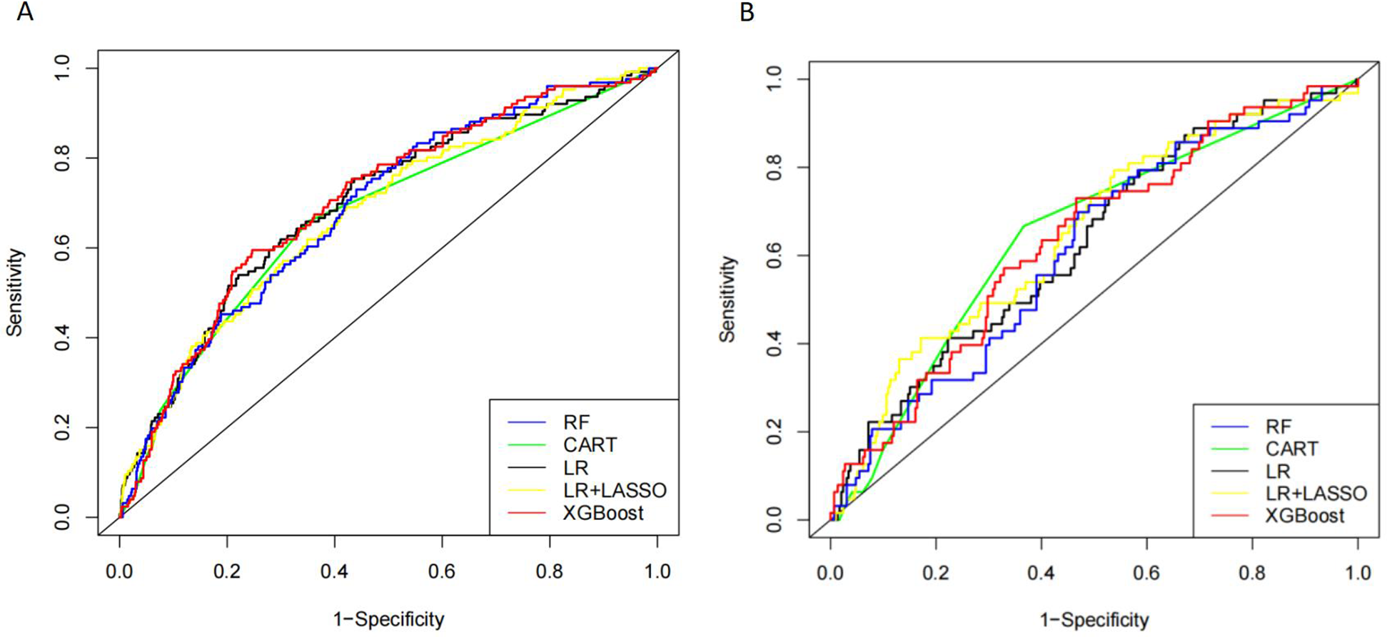 Therefore, this study collected widely validated risk factors for VTE onset in clinical practice and reported risk factors for VTE in CHD patients as research variables. Concurrently, we gathered clinical characteristics and laboratory indicators of hospitalized CHD patients to construct the research dataset. Using this dataset as a platform, we employed various machine learning algorithms to develop predictive models for the occurrence of VTE in hospitalized patients with CHD. In order to improve the interpretability of the results, the machine learning algorithms in this study mainly included logistic regression (LR), logistic regression + least absolute shrinkage and selection operator (LR + LASSO), categorical regression tree (CART), random forest (RF), and extreme gradient boosting (XGBoost).