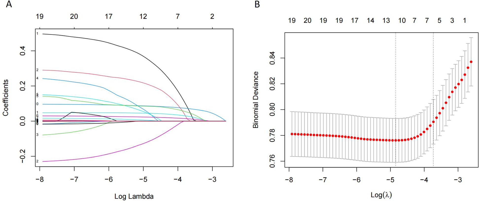 The results of the training set were in Table 2. Compared with patients in the non-VTE group, patients in the VTE group had a higher proportion of females (P < 0.001), rheumatic diseases (P < 0.001), infections (P = 0.006), blood transfusions (P = 0.004), and dyspnea symptoms (P = 0.018).