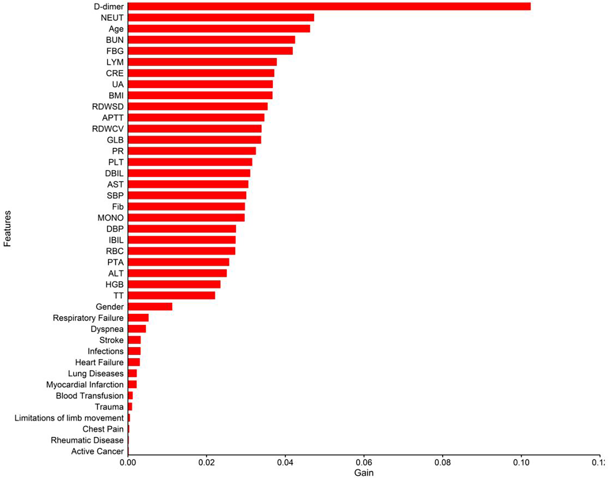 Forty-one risk factors included: Gender, Active Cancer, Heart Failure, Stroke, Rheumatic Disease, Myocardial Infarction, Respiratory Failure, Lung Diseases, Infections, Blood Transfusion, Trauma, Limitations of limb movement, Dyspnea, Chest Pain, Age, Diastolic Blood Pressure (DBP), Systolic Blood Pressure (SBP), Pulse Rate (PR), Body Mass Index(BMI), Prothrombin Activity (PTA), Activated Partial Thromboplastin Time (APTT), Fibrinogen (Fib), Prothrombin Time (TT), D-dimer, Neutrophil Count (NEUT), Lymphocyte Count (LYM), Monocyte Count (MONO), Red Blood Cell Count (RBC), Hemoglobin (HGB), Red Blood Cell Distribution Width-Coefficient Of Variation (RDWCV), Red Blood Cell Distribution Width-Standard Deviation (RDWSD), Platelet Count (PLT), Uric Acid (UA), Direct Bilirubin (DBIL), Indirect Bilirubin (IBIL), Globulin (GLB), Alanine Aminotransferase (ALT), Aspartate Aminotransferase (AST), Creatinine (CRE), Blood Urea Nitrogen (BUN) And Fasting Blood Glucose (FBG).