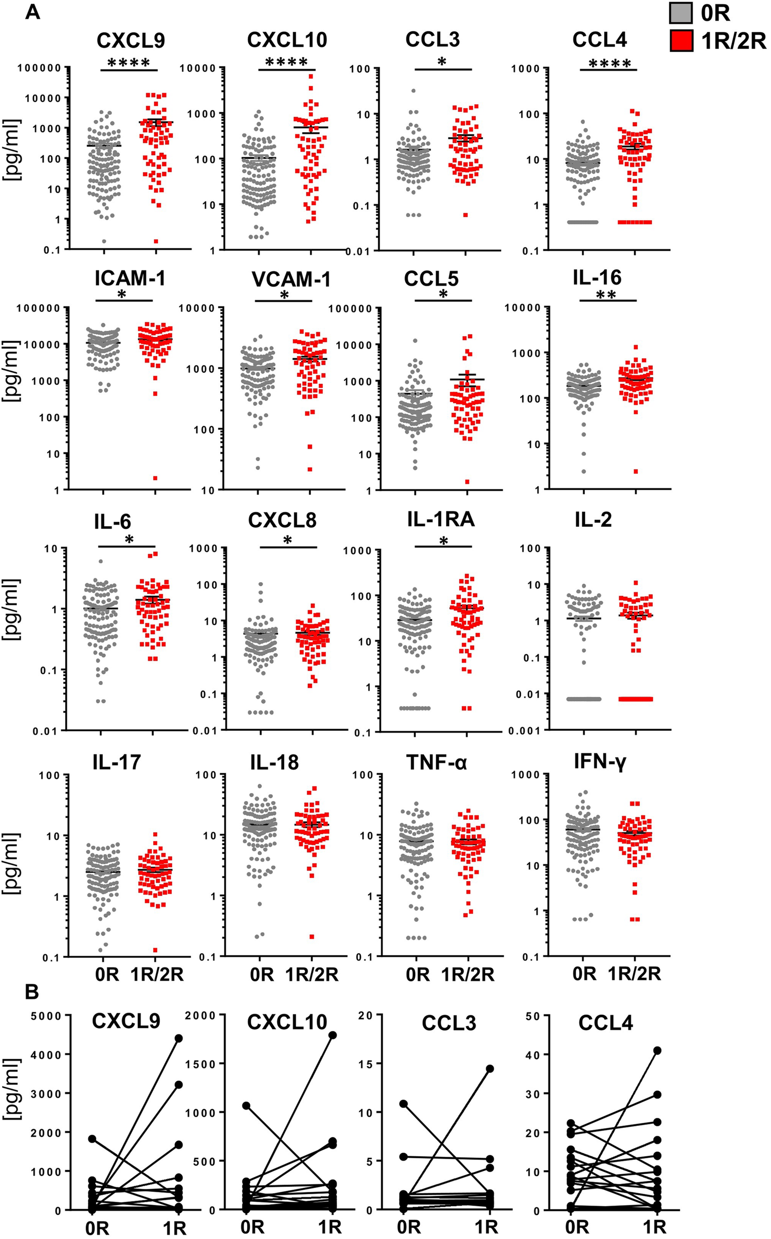 Biopsies obtained during acute rejection reach significantly higher concentrations of some core cytokines and chemokines. Biopsies were taken and cytokine/chemokine concentrations determined as described in Figure 1. (A) For statistical analysis, a two-tailed, unpaired t-test (Kruskal–Wallis) was applied. Data are shown as mean ± SEM (0R, n = 121, gray; 1R/2R, n = 60, red). (B) Paired t-test (Wilcoxon test) was applied on two consecutive biopsies with the second biopsy classified as histopathologic acute mild rejection (1R) (n = 17). *p < 0.05 **p < 0.01, ***p < 0.001, ****p < 0.0001.