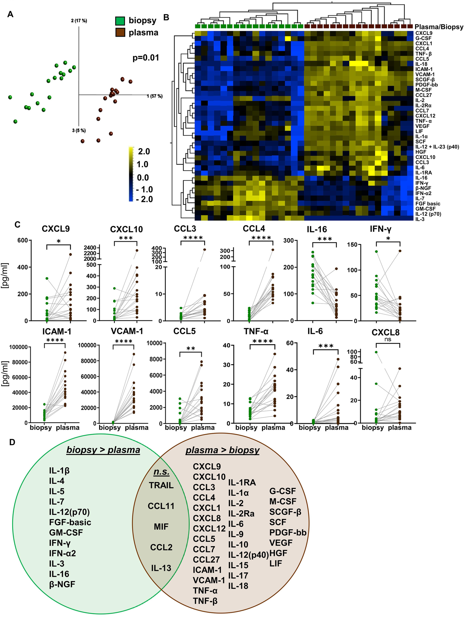 Distinct microenvironment in paired plasma samples and biopsy lysates. Biopsies were taken and cytokine/chemokine concentrations determined as described in Figure 1. Here, only biopsies without histopathologic signs of acute rejection (0R) were included in the analysis and compared with the concentrations of the same 50 proteins quantified in paired peripheral blood plasma samples obtained ± 8 days to EMB procurement (biopsy, n = 17, green; plasma, n = 17, brown). (A) Principal component analysis and (B) unsupervised hierarchical clustering of the 50 measured proteins according to sample origin of either plasma or tissue (p = 0.01 and q = 0.05) are shown. Two-group comparisons were used to identify variables differentially expressed between the groups. (C) Two-tailed, paired Wilcoxon matched-pairs rank test was applied. Data are shown as mean ± SEM. *p < 0.05 **p < 0.01, ***p < 0.001, ****p < 0.0001. (D) Venn diagram mapping proteins significantly higher concentrated either in plasma or heart tissue lysates. Overlap displays proteins with no significant difference.