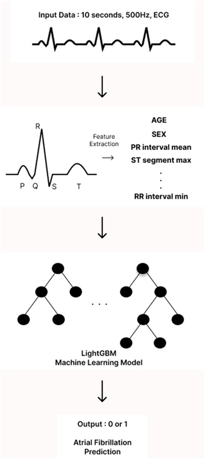 The analysis of ECGs began with the identification of the onset of the P wave, which is the first wave of the cardiac cycle. The ECG signals were then processed using a band-pass filter (0.5–45 Hz) to eliminate unwanted artifacts, such as baseline wandering and power line interference. Next, all components of the P-QRS-T waves—specifically the peaks, intervals, and segments—were detected and located using Neurokit2, an open-source Python package designed for neurophysiological signal processing. From the extracted P-QRS-T components, we calculated descriptive statistics that served as input features for our models. In particular, we focused on the mean, minimum, maximum, and standard deviation of the peaks, intervals, segments, and durations. To better capture the shape of the P wave in our model, we isolated the P wave from the P-off to the P-on point and calculated its skewness and kurtosis. This allowed us to quantify how skewed and peaked the P wave was. Additionally, we computed the changes between successive peaks, intervals, and durations to capture the variability of the ECG waves. Incorporating further details, we added correlation statistics, which comprised the average of the beat-wise Pearson correlation coefficients between a template beat and other beats, as well as f-wave indices to include information related to AF. Descriptive statistics of heart rate variability were also included to provide more context from the ECG data. All features were extracted from all 12 leads of the ECG. For both single-lead and 12-leads ECG models, we employed a light gradient boosting machine (LGBM) algorithm. This machine learning (ML) algorithm is based on gradient boosting decision trees. LightGBM hyperparameters were optimized via Bayesian optimization using the bayes_opt Python library under patient-level cross-validation, targeting PR-AUC with early stopping. The optimized configuration with the highest mean CV PR-AUC was retained; a baseline untuned LightGBM was trained under identical folds for comparison. No external data were used for model selection (Figure 1).