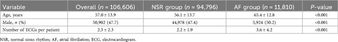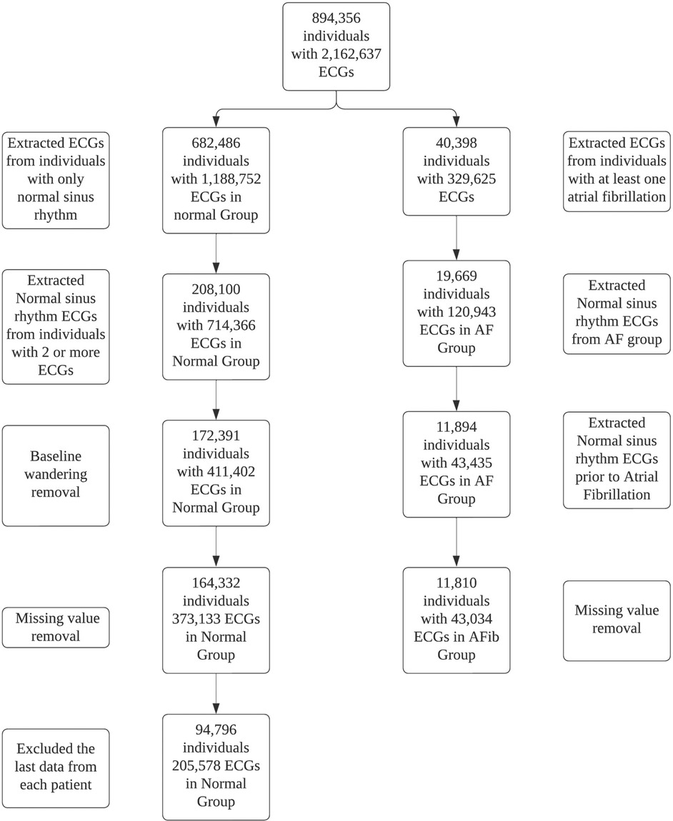 The exclusion criteria for this study were as follows: (1) patients who had a diagnosis of AF documented in their medical records or recorded with a diagnostic code for AF prior to the index AF ECG, (2) patients who did not have a normal sinus rhythm (NSR) ECG before the index AF ECG, (3) patients who had only one NSR ECG, (4) patients with a medical record or diagnostic code indicating AF but without an AF ECG, (5) patients with insufficient medical records to assess their medical status, and (6) patients with abnormal ECGs (defined as any ECG not labeled as NSR or within the normal range). The ECGs of all patients who were not excluded were included in this study.