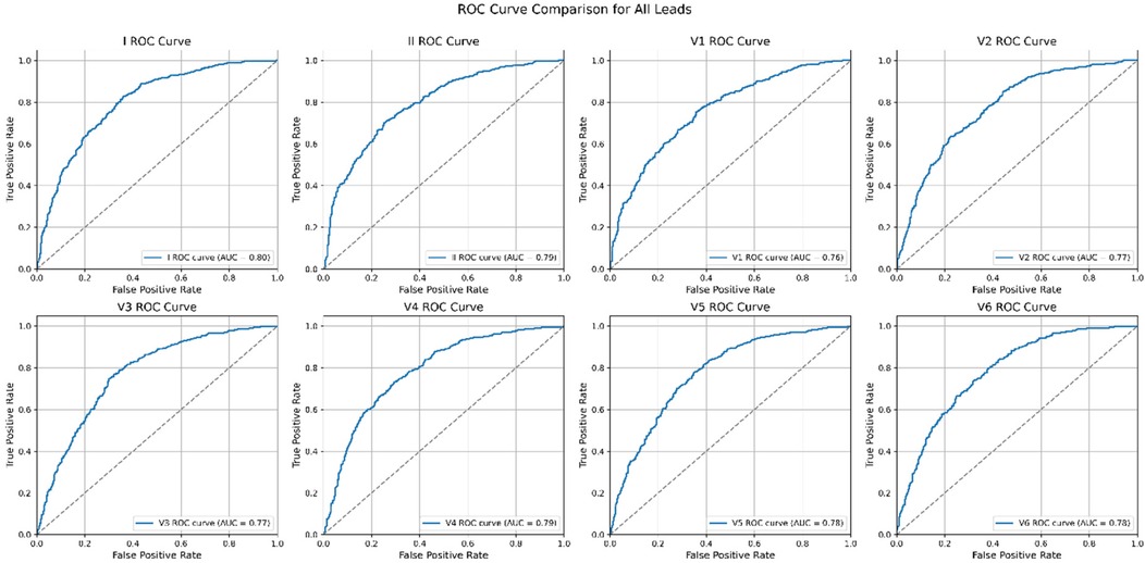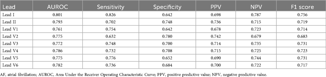 The performance of each single-lead model for AF prediction is presented in Table 2. The AUROC (area under the receiver operating characteristic curve) for the single-lead model from lead I was 0.872, indicating it had the highest performance among the nine leads, followed by V6 (0.865) and lead II (0.862) (Table 2 and Figure 3). However, there was no significant difference in the performance of AF prediction across the 9 leads. The results from the external validation were comparable to those from the internal validation. The AUROC for lead I was the highest at 0.801, followed by leads II (0.793) and V4 (0.786) (Table 3).