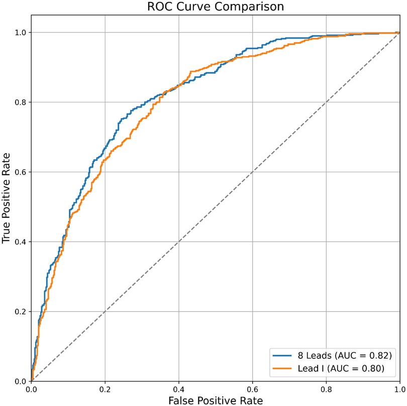 The AUROC of the single-lead (lead I) model was 0.872, while the AUROC of the 12-lead model was 0.905 (single-lead vs. 12-lead model: sensitivity 0.776 vs. 0.800; specificity 0.800 vs. 0.839; positive predictive value 0.448 vs. 0.510; negative predictive value 0.945 vs. 0.952; F1 score 0.568 vs. 0.623) (Table 4). The external validation results were comparable to internal validation (single-lead vs. 12-lead model: sensitivity 0.826 vs. 0.752; specificity 0.642 vs. 0.756; accuracy 0.820 vs. 0.885; F1 score 0.756 vs. 0.754; AUROC 0.801 vs. 0.816) (Table 4 and Figure 4). The 12-lead model showed a small numerical advantage over the single-lead models, but the differences were modest, and overall performance was broadly comparable.