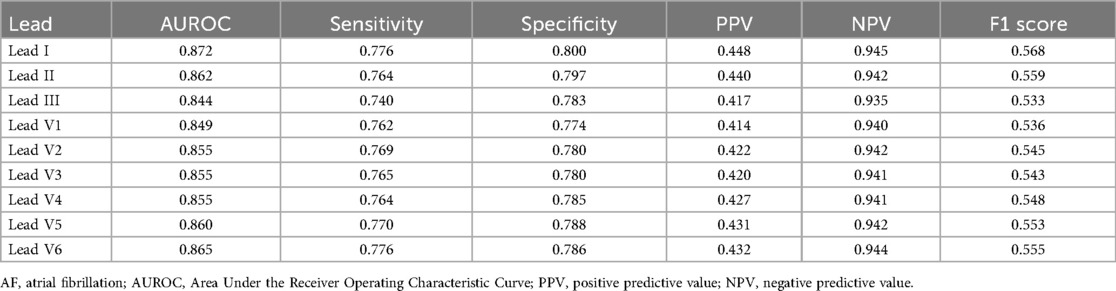 Hygrell et al. demonstrated that a single-lead ECG algorithm, created using a handheld device that measures lead I, can serve as an effective screening tool for predicting AF, especially in population with a wider age distribution (14). Dupulthys et al. developed an AI model incorporating six clinical risk factors alongside a 10-s single-lead ECG, specifically using lead I (15). This single-lead ECG AI algorithm demonstrated performance comparable to that of a 12-lead ECG-based AI model in identifying subclinical AF. Single-lead, handheld intermittent ECG monitoring devices that use lead I are currently widely used. Our research suggested that predicting AF using single lead ECG monitoring based on lead I is feasible.