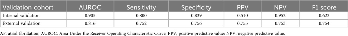 The current study has several limitations. First, it excluded three augmented leads (aVR, aVL, and aVF), which could provide additional insights, limiting the analysis to 9 out of the 12 standard leads. Second, performance metrics for the external validation dataset were lower than those for internal validation, indicating potential variations in patient populations or data quality. While the machine learning model was trained on a large dataset of 248,612 ECGs, there is a risk of overfitting due to the model's complexity. Third, we did not employ synthetic oversampling/undersampling. Finally, the study lacks long-term patient follow-up, which is necessary to evaluate the real-world impact on outcomes like atrial fibrillation-related complications. Long-term randomized controlled studies are essential for assessing the effectiveness of early AF detection and intervention.