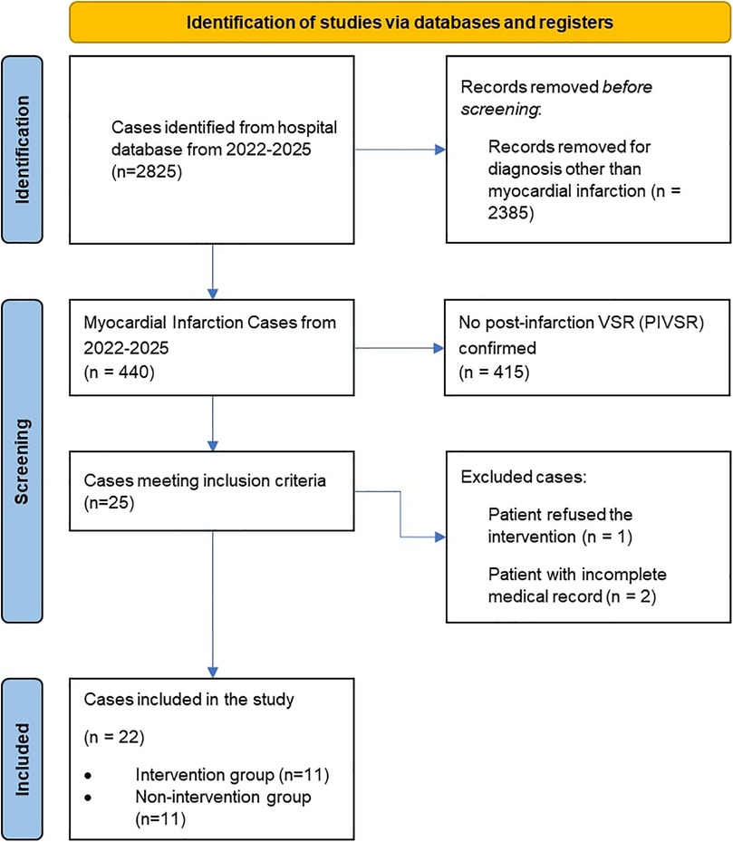 Between January 2022 and May 2025, 22 patients were diagnosed with postinfarction ventricular septal rupture (PIVSR) at the Cardiac Centre, H. Adam Malik Hospital in Medan, Indonesia. All patients underwent percutaneous coronary intervention (PCI) prior to PIVSR management, with a median interval of 3 days (IQR: 1–8 days) following infarction diagnosis. Of these, 11 underwent transcatheter closure (Closure Group), while the remaining 11 died before the procedure could be performed (Non-Closure Group). Although surgical repair remains the gold standard for PIVSR—often combined with CABG, aneurysmectomy, or valve intervention—our center increasingly adopted a primary percutaneous approach for selected patients during the study period (22). This shift was driven by several factors: the technical challenges of operating on acutely infarcted, friable myocardium; limited availability of specialized surgical adjuncts and hybrid capabilities; and the need for timely intervention in hemodynamically unstable patients. Following multidisciplinary evaluation, percutaneous closure—typically with concomitant revascularization—was deemed the most feasible and safer option for these high-risk cases, prioritizing procedural feasibility and patient safety within our institutional context.