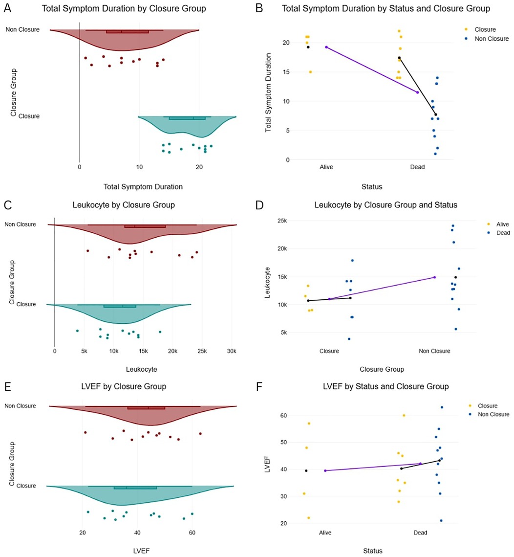 Figure 3. Total symptom duration, leukocyte count, LVEF by closure distribution of key continuous variables by patient group and mortality status. (A) Left Ventricular Ejection Fraction (LVEF) by Closure Group. (B) LVEF by Status and Closure Group. (C) Leukocyte count by Closure Group. (D) Leukocyte count by Closure Group and Status. (E) Total Symptom Duration by Closure Group. (F) Total Symptom Duration by Status and Closure Group.