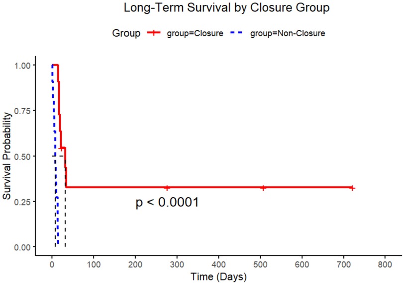 Figure 5. Kaplan–Meier survival curves by closure group. Extended survival probabilities over time. The statistical significance of the survival difference between groups is indicated by the p-value (p < 0.0001).
