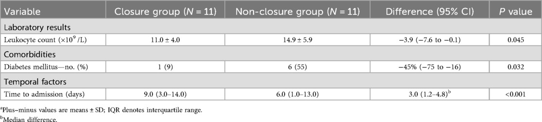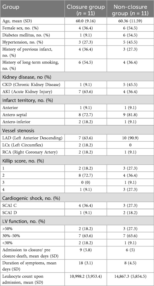 The enrollment and exclusion of cases are detailed in Figure 1, of 22 eligible patients, 11 were allocated to each group. Baseline characteristics, in Table 1, were comparable between groups in terms of age (Closure Group: 60.0 ± 9.2 years; Non-Closure Group: 60 ± 12 years; P = 0.901) and sex distribution (36.4% vs. 54.5% female). However, the Non-Closure Group had a higher prevalence of diabetes mellitus (54.5% vs. 9.1%) and chronic kidney disease (45.5% vs. 9.1%). Both groups predominantly presented with anteroseptal infarction (72.7% vs. 81.8%) and left anterior descending (LAD) artery occlusion (63.6% vs. 90.9%). The Non-Closure Group exhibited more severe heart failure on admission, with higher Killip class 3–4 scores (36.4% and 27.3% vs. 0% and 9.1% in the Closure Group) and a trend toward higher leukocyte counts [14.9 ± 5.9 vs. 11.0 ± 4.0 × 109 /L, mean difference −3.9 (95% CI, −7.6 to −0.1) × 109 /L; P = 0.045].