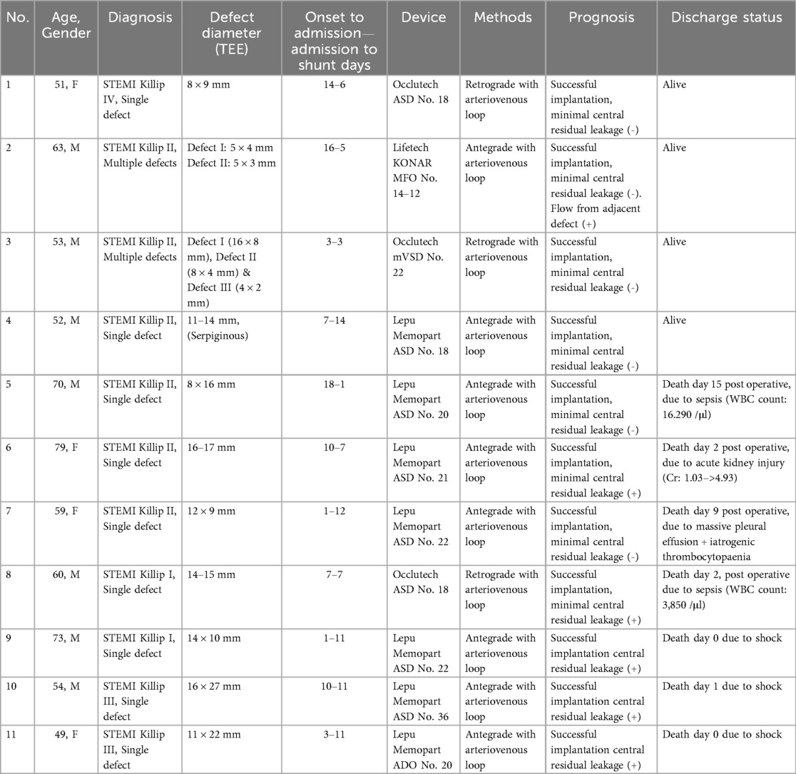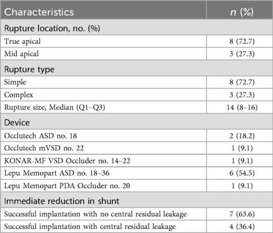 All 11 patients in the Closure Group underwent successful device implantation (Table 2). Ruptures were predominantly apical, with one case involving both apical and mid-muscular defects (Figure 4). Rupture sizes ranged from 5 to 27 mm (mean 13.3 mm). The most commonly used device was the Lepu Memopart ASD occluder (6 cases), followed by Occlutech ASD, mVSD, Lifetech KONAR MFO, and Lepu Memopart PDA occluders.