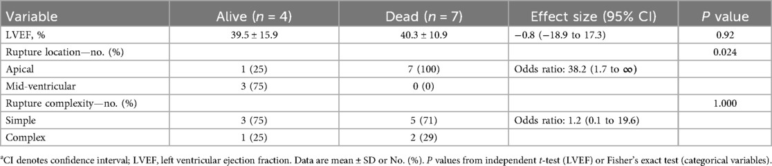Normally distributed continuous data are presented as mean ± standard deviation (SD), while non-normally distributed data are reported as median (first and third quartiles). Categorical data are displayed as frequency (percentage). To evaluate differences between closure and non-closure, comparative analyses is employed. All variables were first assessed for normality using Shapiro–Wilk testing, with group comparisons performed using independent t-test (for normally distributed continuous variables, reported as mean ± SD with Cohen's d effect sizes) or Mann–Whitney U tests [for non-normal distributions, reported as median (IQR) with rank biserial correlation]. Categorical variables were analyzed using Fisher's exact tests (for sparse data with expected cell counts <5) or Pearson ×2 tests, with odds ratios calculated for binary outcomes. Within the closure-eligible subgroup (n = 11) we further stratified outcomes by infarct location, LVEF, and rupture complexity. Survival differences were assessed using Kaplan–Meier analysis. All statistical analyses were performed using RStudio version 4.4.2 (Posit Inc., Boston, MA).