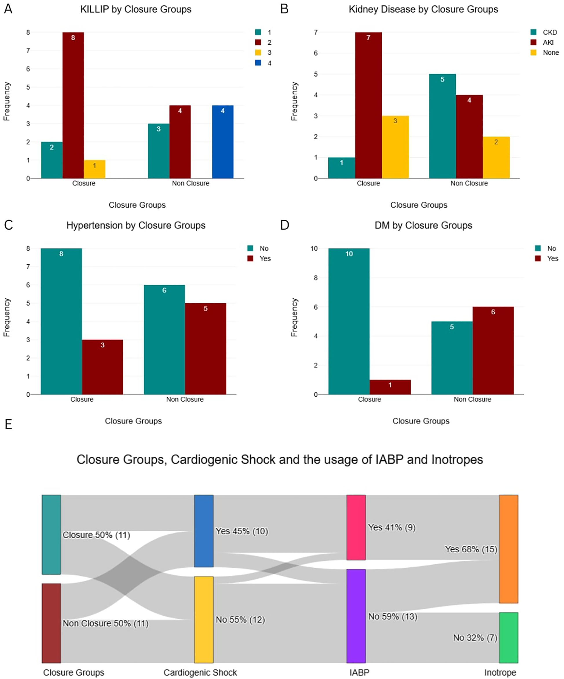 Baseline categorical characteristics and hemodynamic support utilization by patient group. (A) Killip Class distribution. (B) Prevalence of Kidney Disease. (C) Prevalence of Hypertension. (D) Prevalence of Diabetes Mellitus (DM). (E) Interrelationships between Closure Group, Cardiogenic Shock, and the usage of IABP and Inotropes.