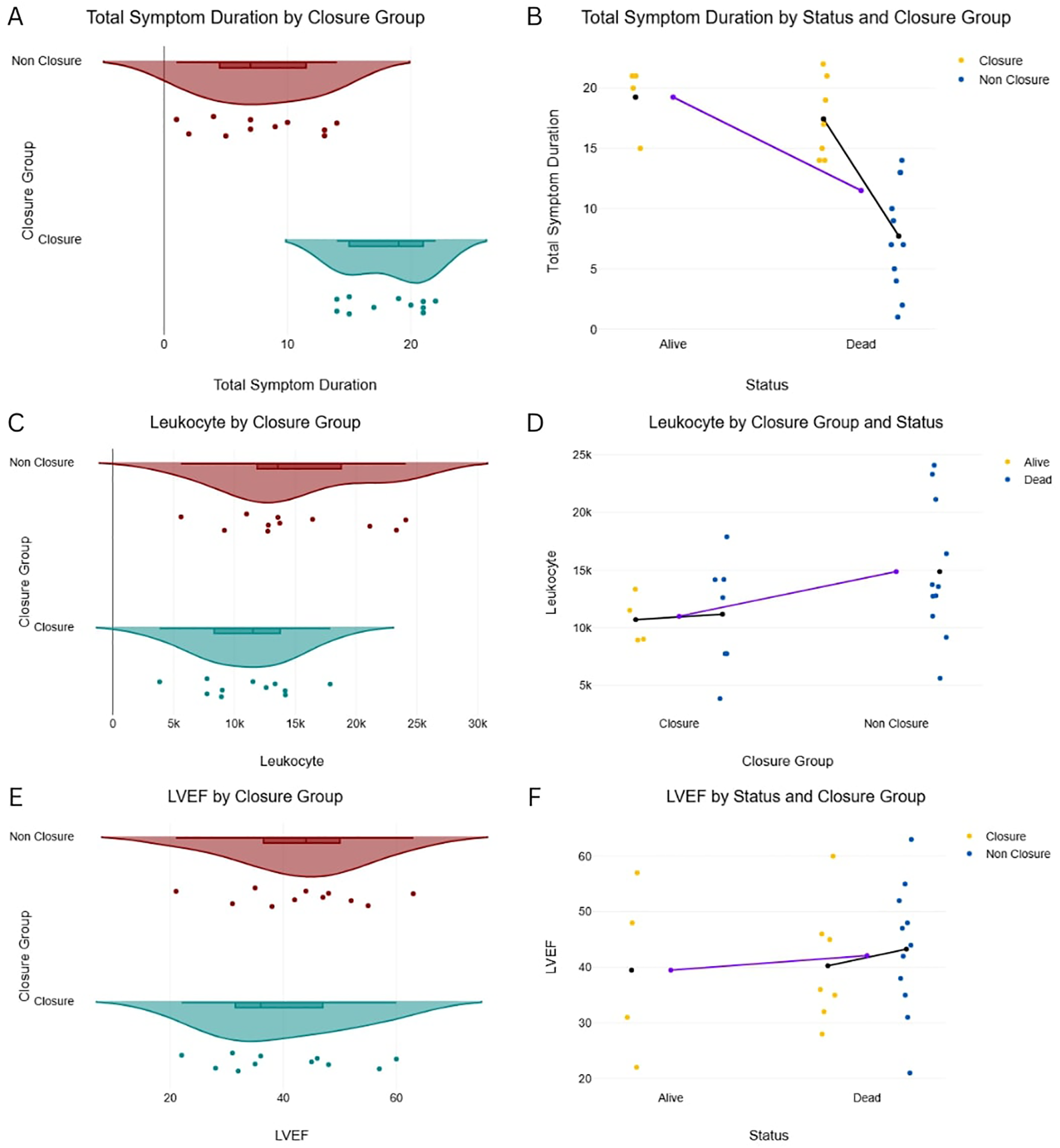 Total symptom duration, leukocyte count, LVEF by closure distribution of key continuous variables by patient group and mortality status. (A) Left Ventricular Ejection Fraction (LVEF) by Closure Group. (B) LVEF by Status and Closure Group. (C) Leukocyte count by Closure Group. (D) Leukocyte count by Closure Group and Status. (E) Total Symptom Duration by Closure Group. (F) Total Symptom Duration by Status and Closure Group.