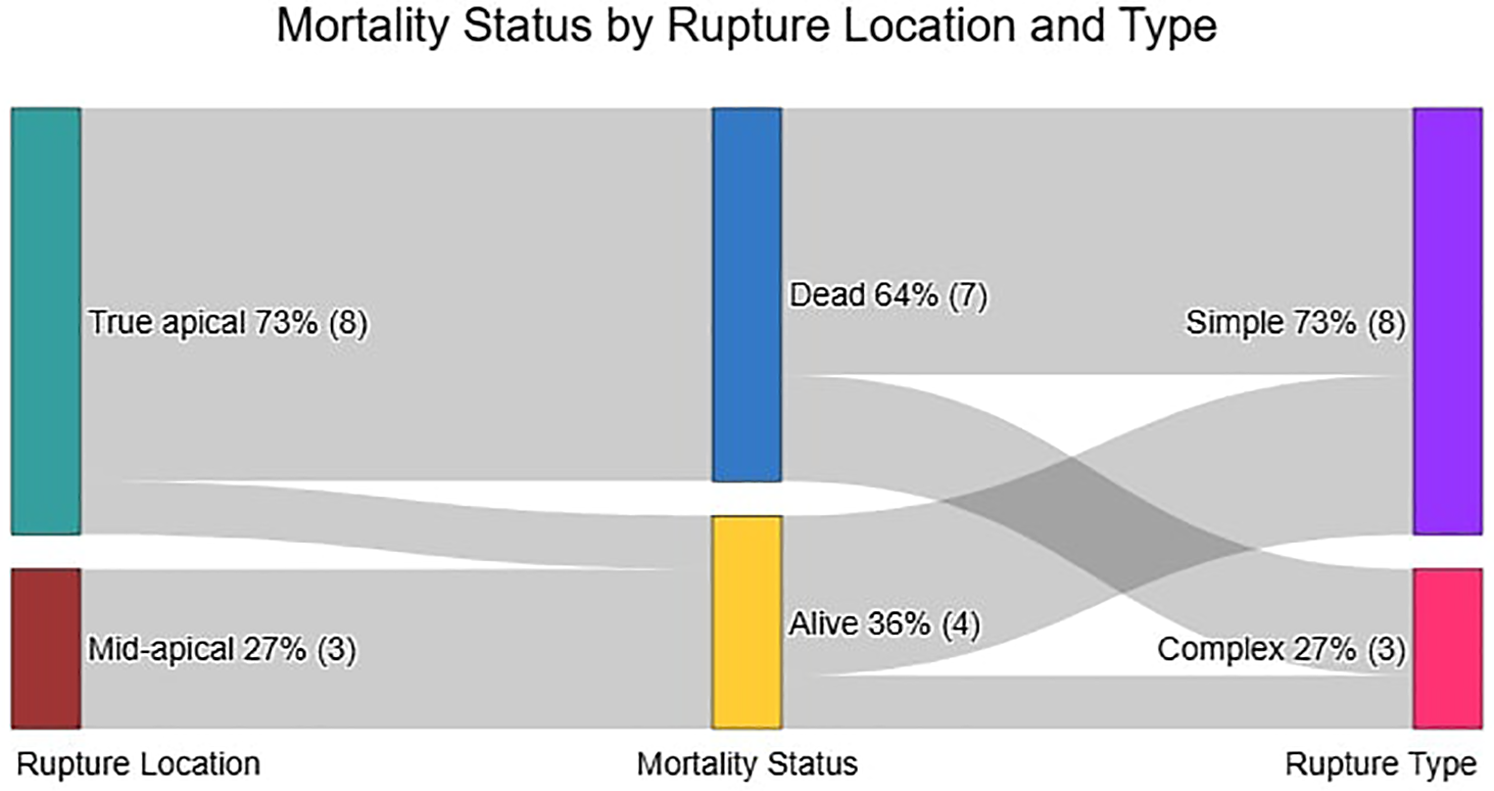 Relationship between rupture location, mortality Status, and rupture type in the closure group.