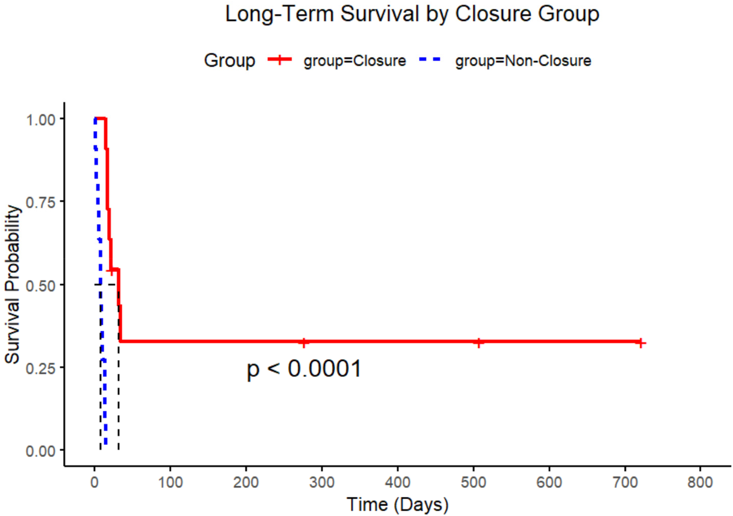 The non-closure group had higher leukocyte counts [14.9 ± 5.9 vs. 11.0 ± 4.0 × 10⁹/L, mean difference −3.9 (95% CI, −7.6 to −0.1) × 109 /L; P = 0.045], greater diabetes prevalence [54.5% vs. 9.1%; risk difference −45% (−75 to −16); P = 0.032], and shorter pre-closure survival (Mean 6 ± 5 days vs. 9 ± 6 days; P < 0.001). Among closure patients, apical rupture predicted universal mortality [7/7 deaths vs. 0/4 with mid-ventricular ruptures; risk difference 75% (25–100); P = 0.024], while LVEF (P = 0.92) and complexity (P = 1.000) showed no association. Survival favored closure (log-rank P < 0.001).