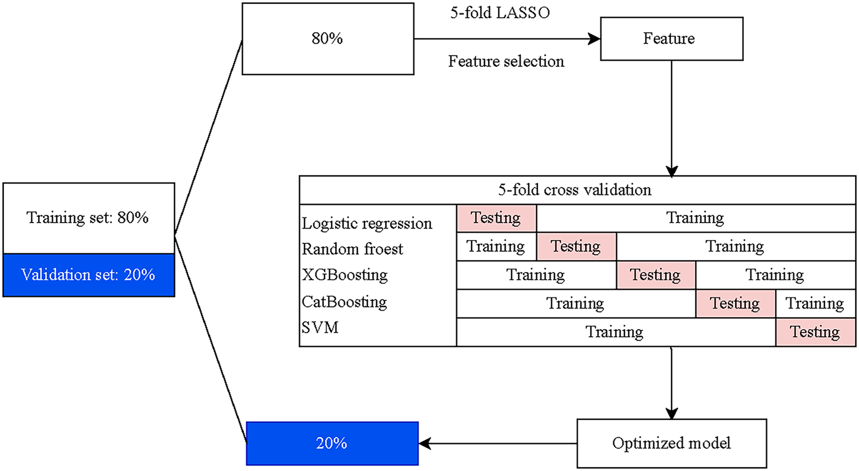 Five ML algorithms were carried out to choose a classifier model with the optimal recognition of HF, including logistic regression (LR), random forest (RF), eXtreme Gradient Boosting (XGBoost), Category Boosting (CatBoost), and Naive Bayes (NB). Features for model construction were selected utilizing the five ML algorithms with the five-fold cross-validation. In the training set, data were divided into five subsets, four of which were served as the training set and the other as the validation set. Five iterations were then performed, and the means of the cross-validations and the best performance fold were taken as the final classification results to screen the optimal screening model. The screening ability of the final model was further validated by the test set. The flow chart of model development and validation is presented in Figure 1.