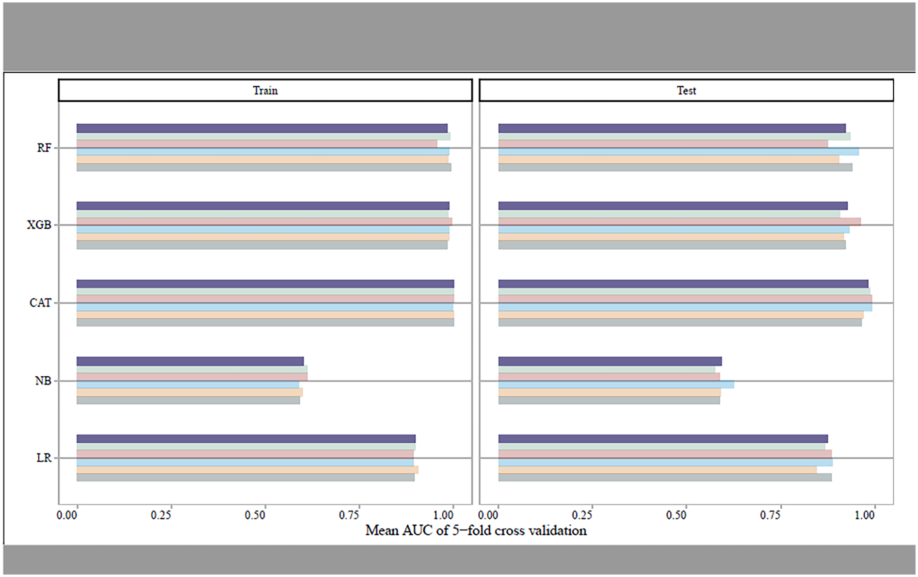 The mean AUCs of the five-fold cross-validation for different machine learning models in training set and test set, respectively.