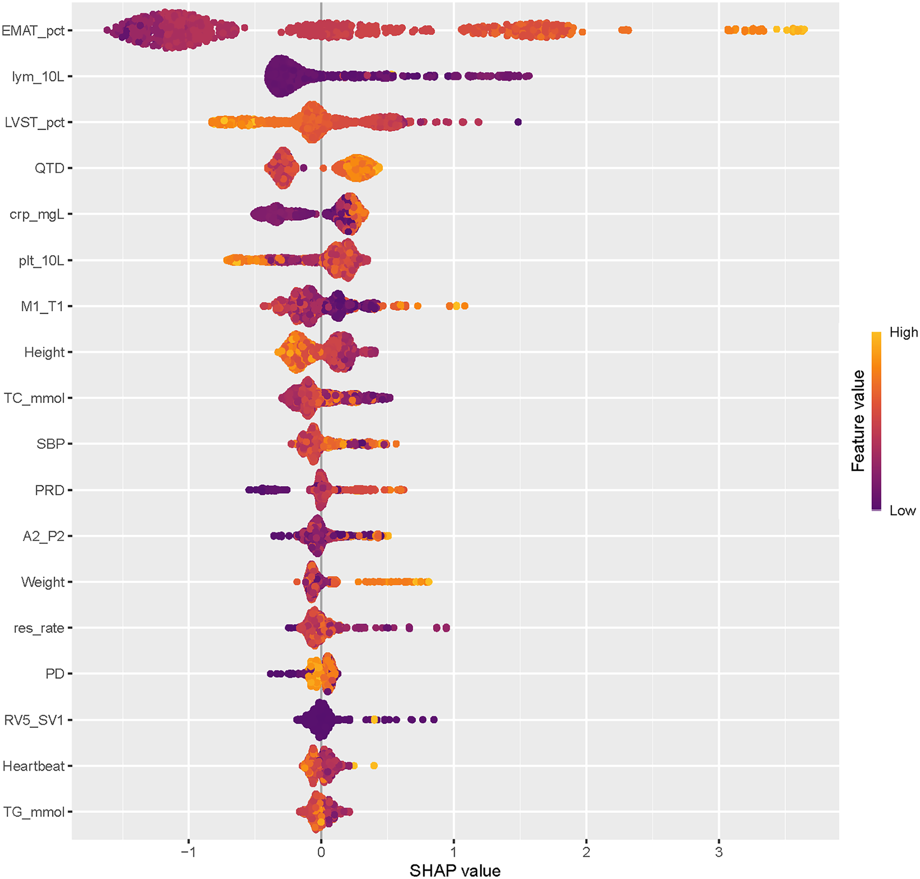 Furthermore, SHAP values were used to uncover the black box of ML and to facilitate the model interpretation. In the present study, the top 5 most influential features contributing to this model were EMAT, lymphocyte, LVST, CRP, and platelet. These factors have all been proven associated with the occurrence of HF. EMAT, defined as the period from the onset of the Q wave to the first peak of S1, reflecting the timing of electrical excitation and mechanical movement in the heart. Early studies have indicated that this timing is prolonged in HF patients. Li et al. (11) have reported that the heart sound and ECG signal index EMAT contributes to the diagnosis of ejection fraction <50%. Trabelsi et al. (29) found that HF patients exhibited higher EMAT and lower LVET compared to non-HF patients. The incidence of HF is linked to chronic systemic inflammation. We observed that elevated CRP levels are associated with an increased likelihood of HF occurrence. Burger et al. (30) similarly identified CRP as an independent risk factor for HF in patients with cardiovascular diseases. In summary, this research yielded results consistent with those obtained through traditional statistical analysis and ML-model studies, providing further validation of our findings.
