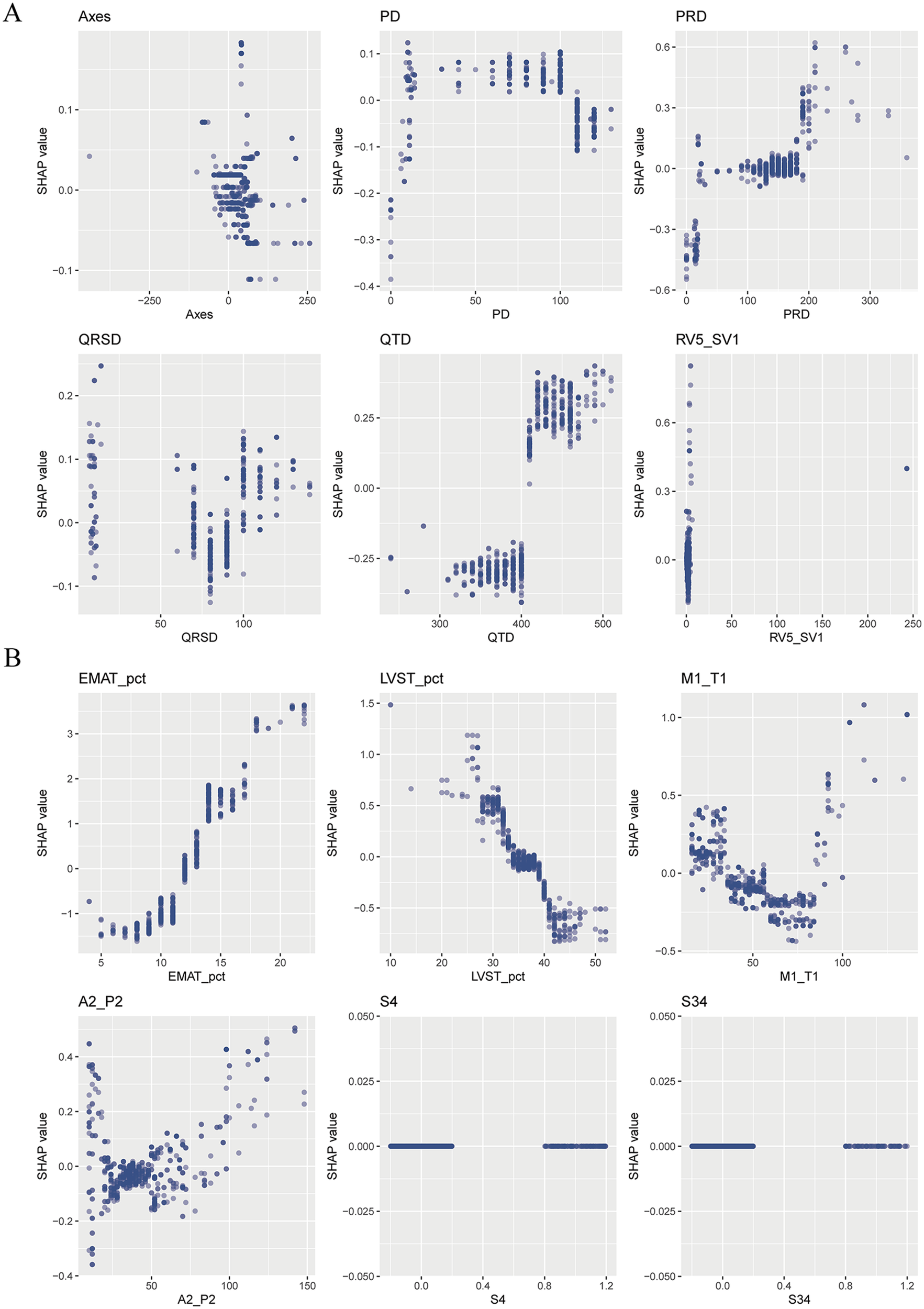 The SHAP dependence plot of the catBoost model. (A) ECG parameters; (B) PCG parameters.