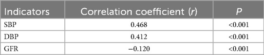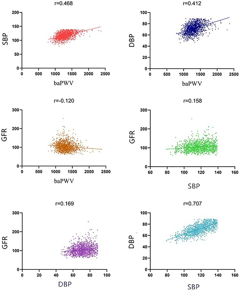 Pearson correlation analysis revealed that brachial-ankle pulse wave velocity (baPWV) was positively correlated with systolic blood pressure (SBP) and diastolic blood pressure (DBP), with correlation coefficients of 0.468 and 0.412, respectively (P < 0.001). Additionally, baPWV demonstrated a negative correlation with the Glomerular Filtration Rate (GFR), with a correlation coefficient r = −0.120 (P < 0.001), as shown in Table 3. Furthermore, GFR was positively correlated with SBP and DBP, with correlation coefficients of 0.158 and 0.169, respectively (P < 0.001), as shown in Table 4. Figure 1 presents scatter plots that illustrate the relationships among blood pressure, GFR, and baPWV, visually illustrating the significant correlations identified.