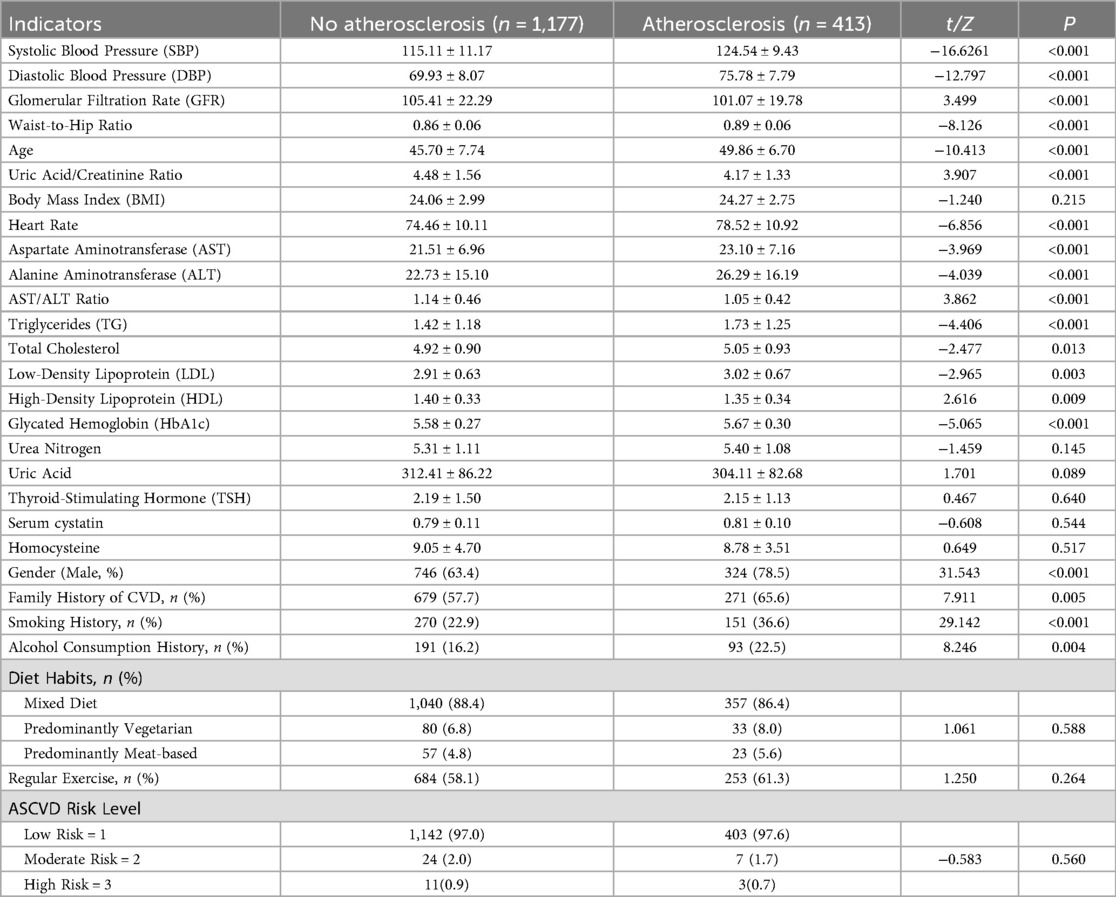In Table 1, the indicators for individuals with subclinical atherosclerosis are compared to those for individuals without it. A P-value less than 0.05 in the table indicates a statistically significant association between the indicator and subclinical atherosclerosis. As shown in Table 1, the following indicators were associated with subclinical atherosclerosis: systolic blood pressure, diastolic blood pressure, heart rate, glomerular filtration rate, waist-to-hip ratio, age, sex, uric acid to creatinine ratio, AST to ALT ratio, triglycerides, total cholesterol, low-density lipoprotein, high-density lipoprotein, glycated hemoglobin, family history of cardiovascular disease, smoking history, and alcohol consumption.
