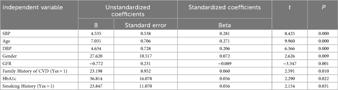 Table 2 shows the results of a multivariate linear regression analysis with baPWV as the dependent variable: age, gender, SBP, DBP, GFR, family history of cardiovascular disease (CVD), HbA1c, and smoking history were significantly correlated with baPWV (P < 0.05).