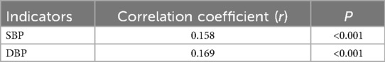 This study employed standardized methods for measuring blood pressure in an office setting. Participants sat with their arms relaxed. Measurements were taken after at least 5 min of rest in a quiet environment. Calibrated electronic blood pressure monitors, such as the Omron HEM-907 model, were used. Additionally, the room temperature was controlled to prevent external interference. Systolic blood pressure (SBP) and diastolic blood pressure (DBP) were measured twice for each participant. The average of these measurements was calculated to enhance accuracy and reliability. All blood pressure values were recorded in millimeters of mercury (mmHg). If the difference between the two measurements exceeded 20 mmHg for systolic or 10 mmHg for diastolic blood pressure, a third measurement was taken for verification. All measurements were conducted by trained medical personnel to ensure consistency and standardization. The results were recorded in electronic health files for further analysis.