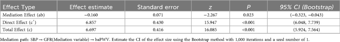 We conducted a mediation analysis with baPWV as the dependent variable, SBP as the independent variable, and GFR as the mediating variable, and included age, gender, family history of CVD, smoking history, and HbA1c as covariates. Specifically, Table 5 presents the mediation analysis results. GFR significantly mediated the relationship between SBP and subclinical atherosclerosis (P < 0.05). The mediation effect (ab, representing the indirect effect) and the direct effect (c′) had opposite signs. This indicates that although elevated SBP increased baPWV, the positive effect of SBP on baPWV was reduced by an increase in GFR.