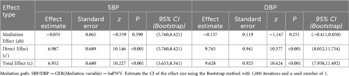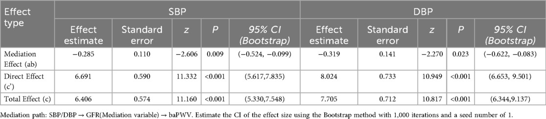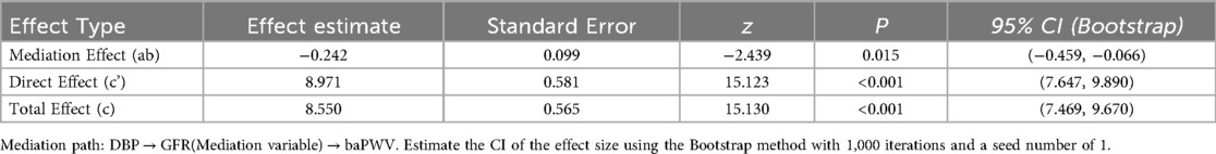 Similarly, when baPWV was treated as the dependent variable and DBP as the independent variable, GFR again showed a significant mediating effect (P = 0.015), as illustrated in Table 6.
