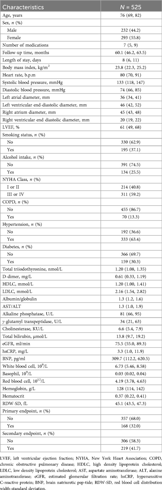 A total of 525 patients were enrolled in our study, comprising 232 (44.2%) males and 293 (55.8%) females. The median follow-up time was 60.1 (46.2, 63.5) months. During the follow-up period, 168 (32.0%) patients reached the primary endpoint and 219 (41.7%) patients reached the secondary endpoint. The median age of the participants was 76 (69–82) years, and the median length of stay was 8 (6–11) days. Patients with NYHA functional class III or IV symptoms at discharge accounted for 59.2%. The baseline characteristics of the patients are shown in Table 1.