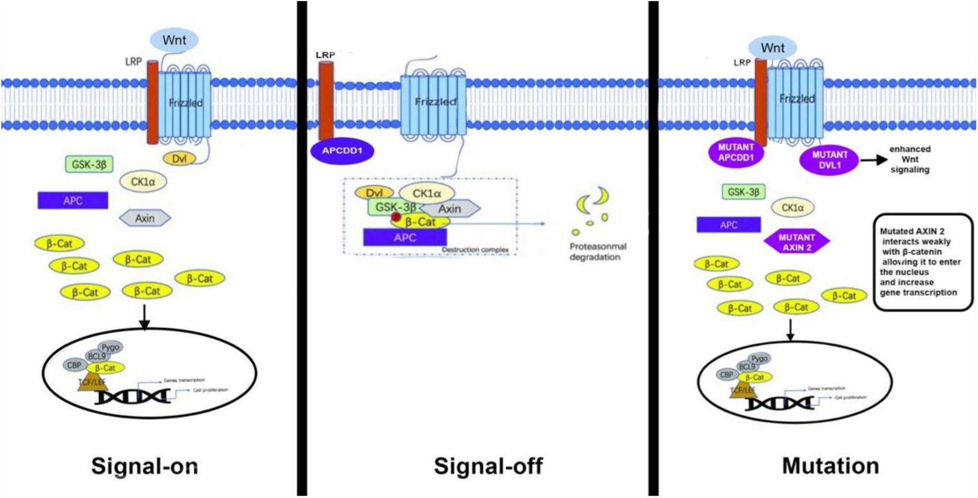 In our case, compound heterozygous mutations were detected in APCDD1, AXIN2, and DVL1. Although no variant alone was classified as pathogenic, the presence of heterozygous mutations in APCDD1, AXIN2, and DVL1, all of which are implicated in WNT signaling, suggests a polygenic pathogenesis of AS with a combinatorial inheritance from the parents. In the context of congenital aortic stenosis, the identified missense variants in DVL1, AXIN2, and APCDD1 collectively suggest an intriguing mechanism implicating enhanced WNT signaling activity. Specifically, the missense variant in DVL1 may enhance its affinity toward the Frizzled (Fz) receptor, thereby potentiating WNT pathway activation through stabilized receptor interaction and downstream signaling. Concurrently, the variant identified in AXIN2 potentially reduces its affinity for β-catenin, impairing the effective assembly of the β-catenin degradation complex. This decreased affinity can result in elevated cytoplasmic β-catenin levels, facilitating nuclear translocation and enhanced transcription of WNT-responsive genes involved in valvular interstitial cell proliferation and matrix remodeling. Similarly, the missense variant in APCDD1 may result in reduced affinity toward LRP5/6 co-receptors, diminishing its inhibitory capacity on WNT signaling (Figure 2). Collectively, these subtle molecular alterations—enhanced DVL1-Fz interaction, diminished AXIN2–β-catenin interaction, and attenuated APCDD1–LRP5/6 binding—could synergistically amplify canonical WNT signaling. Such a mechanism aligns well with documented evidence that dysregulated WNT signaling contributes to pathological valve thickening, fibrosis, and calcification—hallmarks of aortic stenosis (9).