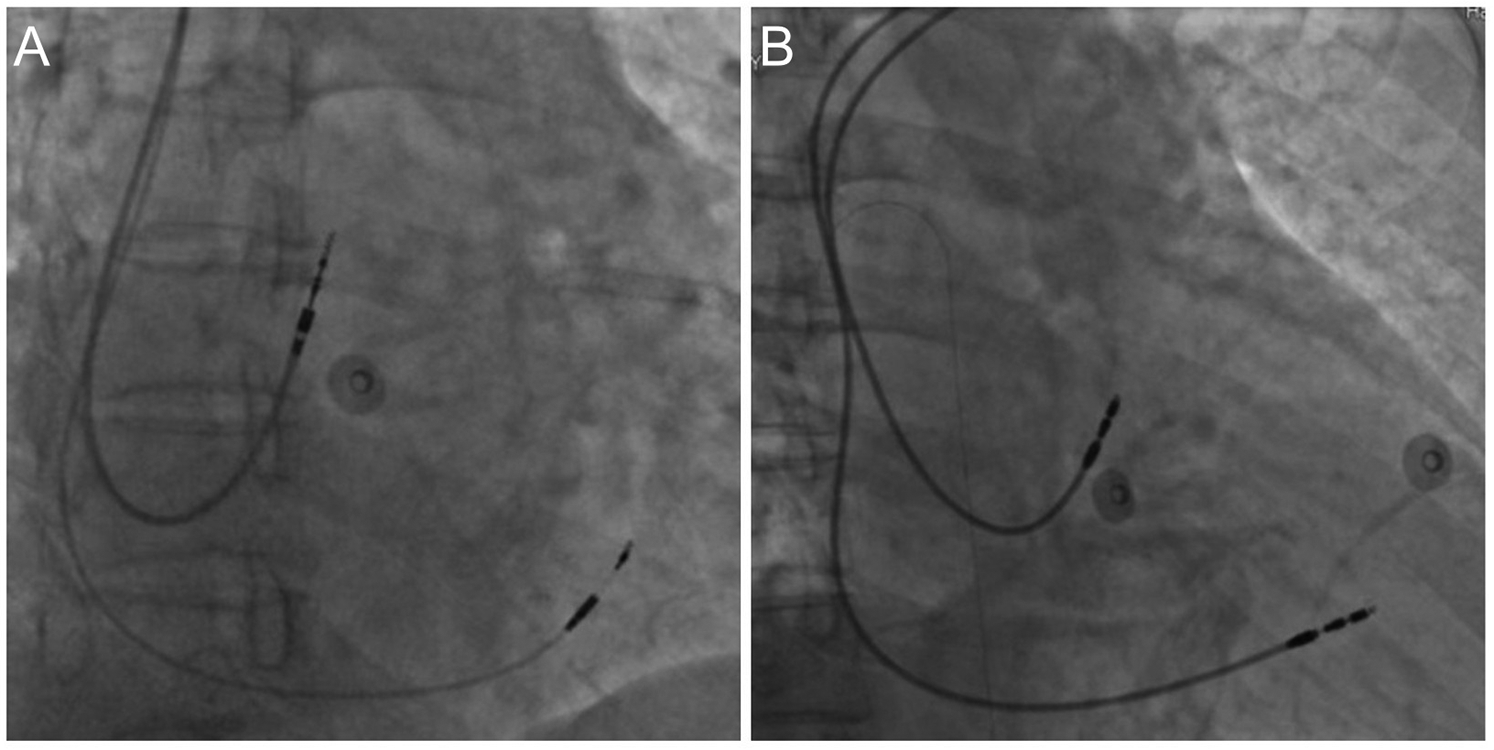 Dual-Chamber pacemaker implantation. (A) Left bundle branch pacing; (B) right ventricular septal pacing.