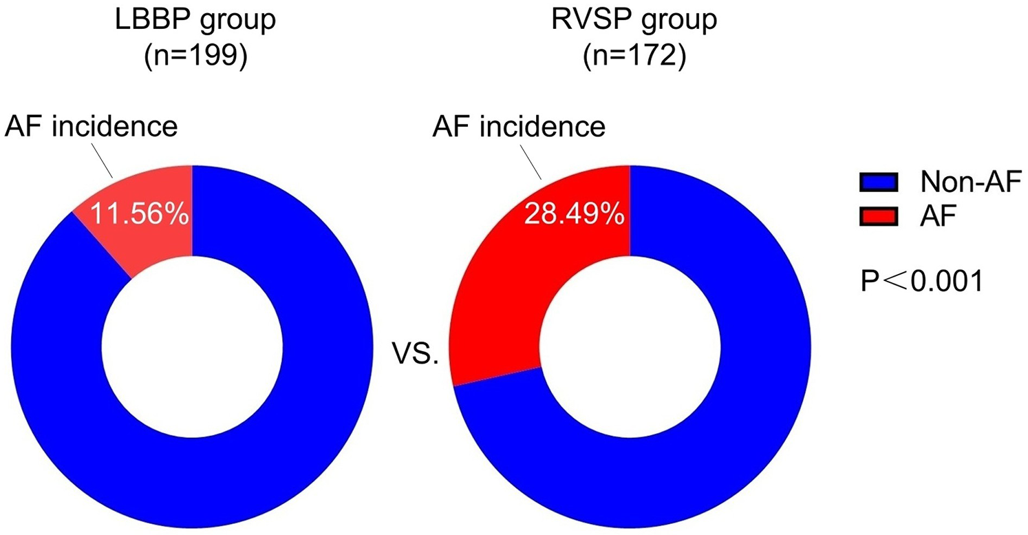 The baseline characteristics of patients in the non-AF and AF groups are shown in Table 1. The prevalence of hypertension was significantly higher in the AF group compared to the non-AF group (54.17% vs. 37.46%, P = 0.010). Regarding the implantation site of the ventricular lead, the proportion of left bundle branch pacing (LBBP) was significantly lower in the AF group compared to the non-AF group (31.94% vs. 58.86%, P < 0.001). In terms of ventricular pacing percentage (VP), the proportion of patients with VP 0%–39% was significantly lower in the AF group compared to the non-AF group (23.61% vs. 44.48%, P = 0.001). Conversely, the proportion of patients with VP 40%–79% was significantly higher in the AF group compared to the non-AF group (26.39% vs. 11.04%, P = 0.002). Figure 2 demonstrates that the incidence of AF was significantly lower in the LBBP cohort compared to the RVSP cohort (11.56% vs. 28.49%, P < 0.001).