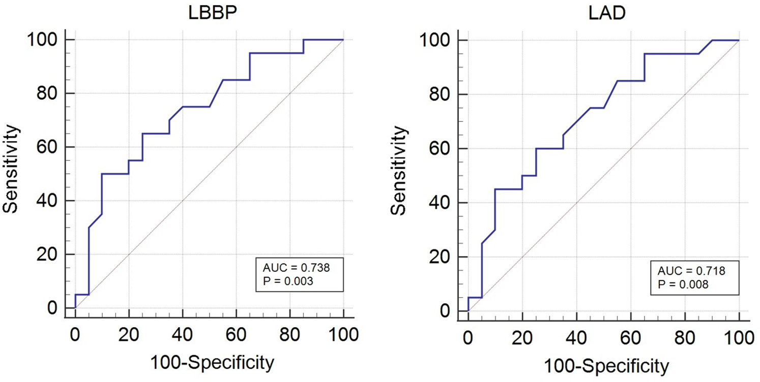 Diagnostic efficiency of LBBP and LAD for new-onset AF using standard ROC curve analysis. AF, atrial fibrillation; LBBP, left bundle branch pacing; LAD, left atrial diameter.