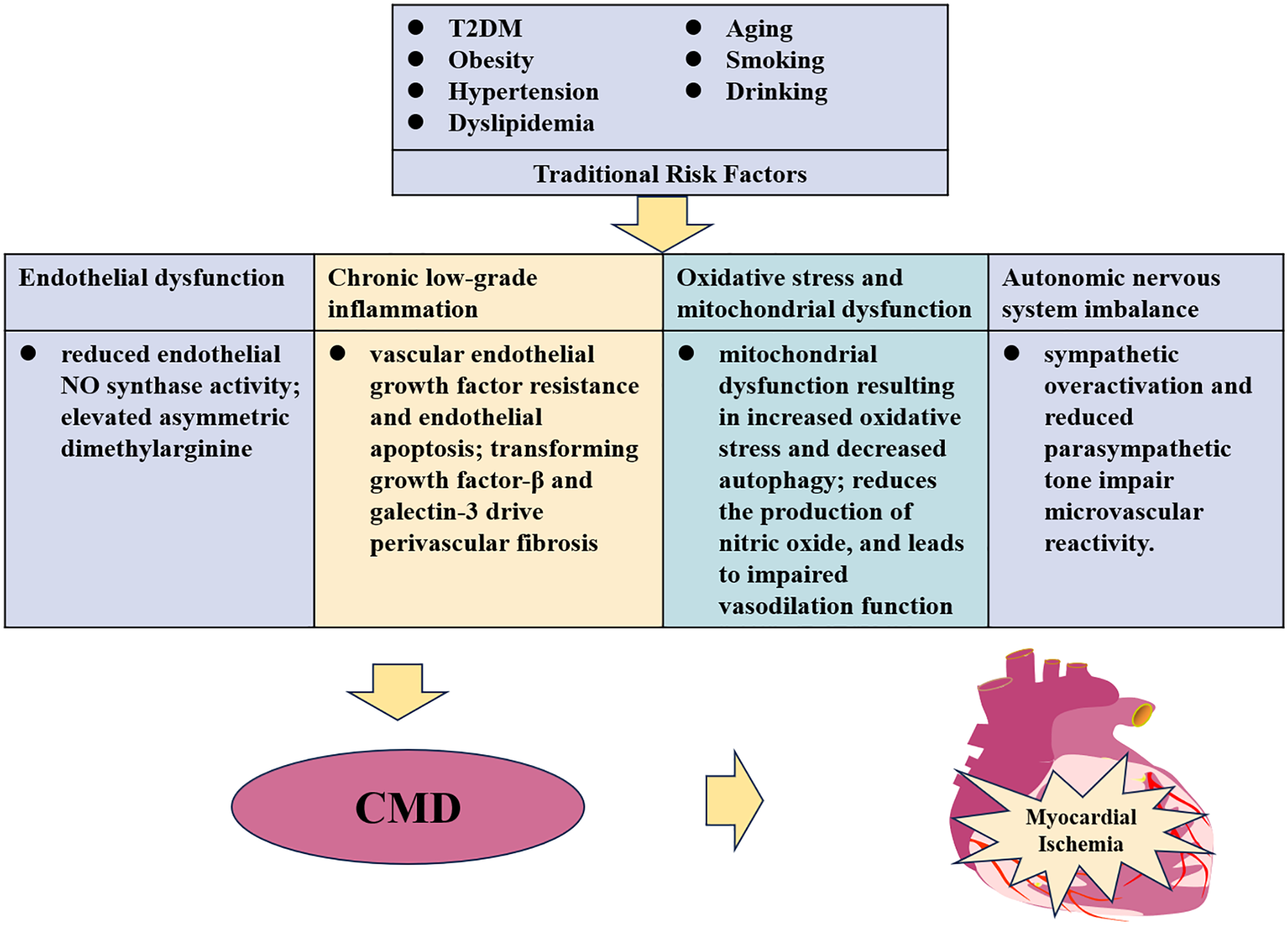 Pathophysiological mechanisms linking traditional risk factors to coronary microvascular dysfunction (CMD) and myocardial ischemia. This schematic illustrates the multifactorial pathogenesis of CMD. Traditional cardiovascular risk factors [e.g., type 2 diabetes mellitus (T2DM), obesity, hypertension, dyslipidemia, aging, smoking, and alcohol consumption] converge to drive four core pathological mechanisms: Endothelial dysfunction: Characterized by reduced nitric oxide (NO) bioavailability due to impaired endothelial NO synthase (eNOS) activity and elevated asymmetric dimethylarginine (ADMA). Chronic low-grade inflammation: Mediated by vascular endothelial growth factor (VEGF) resistance, endothelial apoptosis, and perivascular fibrosis driven by transforming growth factor-β (TGF-β) and galectin-3. Oxidative stress and mitochondrial dysfunction: Results in excessive reactive oxygen species (ROS) production, impaired autophagy, and diminished vasodilatory capacity. Autonomic nervous system imbalance: Sympathetic overactivation and reduced parasympathetic tone impair microvascular reactivity. These interconnected mechanisms collectively contribute to CMD, ultimately leading to myocardial ischemia. Arrows indicate the progression from risk factors to end-organ damage.