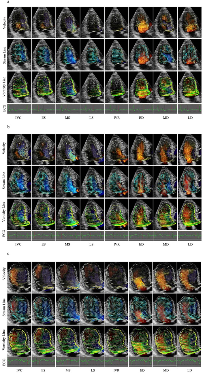 During isovolumic contraction, a large vortex was generated along the septum, which was more irregular in Group I and Group II. In systole, the flow accelerated from the apex toward the outflow tract, and then, a part of the flow turned from the outflow to the anterior mitral leaflet. Hence, the oblong vortex was generated in the upper middle of the LV and dissipated quickly. However, flow toward the apex was winding along the posterior wall in Group I, whereas some tiny vortexes remained at the apex and persisted longer in Group II. The early diastolic flow spreads toward the apex, with small vortices curling back beneath the anterior and posterior mitral leaflets. In mid-diastole, a clockwise round or oblong vortex arose in the whole cavity or at the middle segment. However, the flow still dominantly spread toward the apex in part of Group I, and a flow circle occupied the whole LV chamber with several small disordered vortexes and persisted through diastole in most of Group II. At the end of diastole, several small vortexes were beneath the anterior and posterior mitral leaflets, with the anterior ones being larger, whereas the vector in Group I was irregular in the base segment.