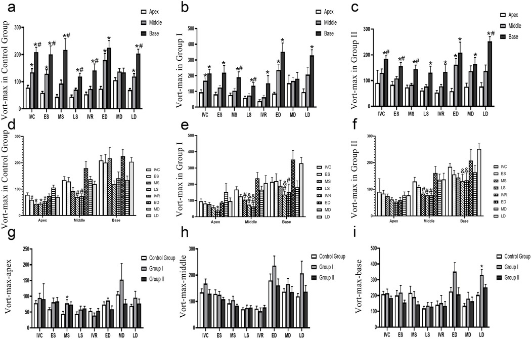 Figure 3. Evolution of vort-max in different groups. (a–c) The Vort-max differences in the base, middle and apex segments, *P < 0.05, vs. apex segment, #P < 0.05, vs. mid segment, (d–e) the Vort-max differences in different times, *P < 0.05, vs. MD, #P < 0.05, vs. ED, & P < 0.05, vs. LD, (f–i) the Vort-max differences in different groups, *P < 0.05, vs. Control Group, #P < 0.05, vs. Group I. IVC, isovolumic contraction; ES, early systole; MS, mid-systole; LS, late systole; IVR, isovolumic relaxation; ED, rapid filling (early diastole); MD, slow filling (mid-diastole); LD, atrial contraction (late diastole).