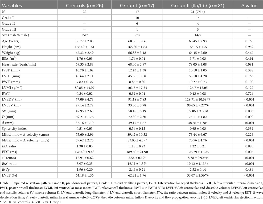 A total of 71 subjects referred for echocardiography were screened for potential inclusion. The exclusion criteria were as follows: (1) insufficient quality echocardiographic images; (2) unstable clinical or hemodynamic status; or (3) nonsinus rhythm, significant aortic regurgitation and stenosis, mitral valvular disease, moderate-to-severe pulmonary hypertension, congenital heart disease, myocarditis, or pericarditis. Of these, 11 subjects were excluded due to the following reasons: inadequate acoustic windows for VFM analysis (n = 6), significant (greater than moderate) valvular disease (n = 1), persistent atrial fibrillation (n = 2), and LV cavity size exceeding the VFM sector width (n = 2). The final study cohort comprised 64 subjects who met all inclusion and exclusion criteria. The subjects were divided into 3 groups as recommended in the guidelines for echocardiographic examination in EAE/ASE (21). This cross-sectional study included 22 controls [Control Group], 17 patients [Group I] and 21 patients [Group II]. Patients in Control Group were diagnosed with no history of cardiovascular diseases, no symptoms or signs of cardiac diseases, and normal electrocardiogram and echocardiography results. Patients in Group I all met the criteria for heart failure with preserved ejection fraction (HFpEF; LVEF ≥50%).Patients in Group II the criteria for heart failure with reduced ejection fraction (HFmrEF or HFrEF; LVEF <50%), which were sub-classified into heart failure with mildly reduced ejection fraction (HFmrEF; LVEF 40%–49%) (Group IIa)and heart failure with reduced ejection fraction (HFrEF; LVEF <40%) (Group IIb).All grouping criteria refer to the recommendations of the 2016 ASE/EACVI guidelines (22) and 2025 ASE guidelines (23). Furthermore, diastolic dysfunction for all patients in Group I and Group II was graded as Grade I, II, or III also based on the above recommendations (22, 23). A flow diagram detailing participant enrollment and allocation was shown in Figure 1.