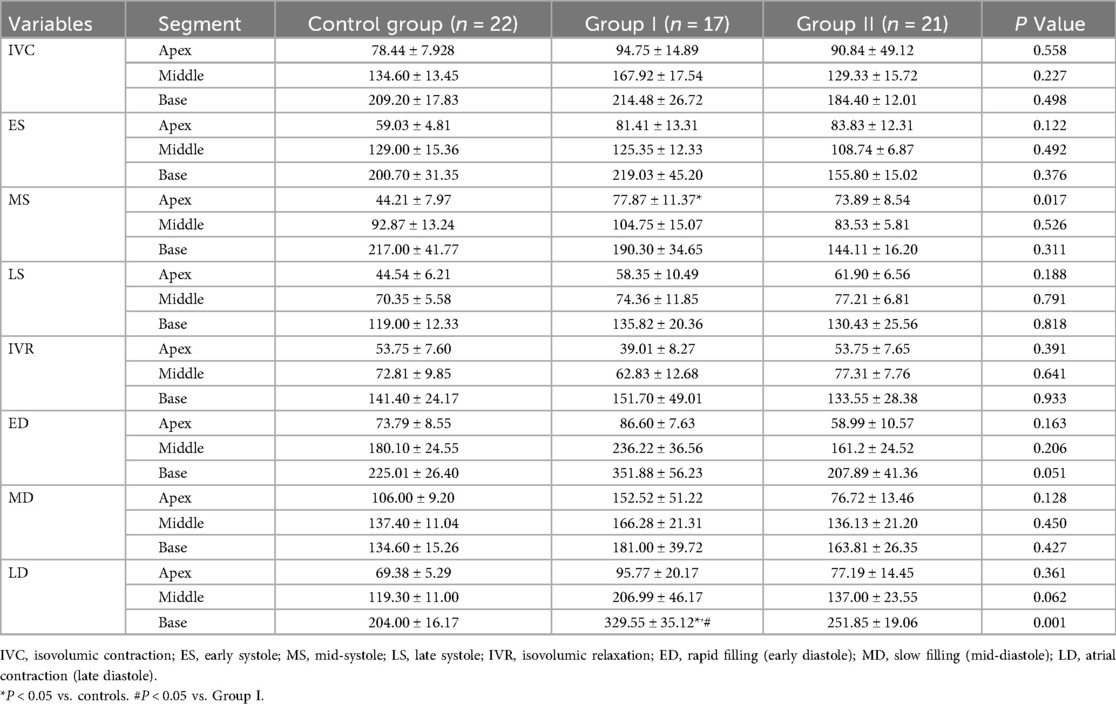 In the control group, significant temporal variations were primarily localized to the apex and middle segments, while the base segment remained stable. Values during ES, MS, LS, and IVR were all significantly lower compared to the value at MD in apex (P < 0.05). A significant decrease was observed during LS and IVR when compared to ED in middle (P < 0.05). No significant variations were found across any of the analyzed cardiac phases in base.