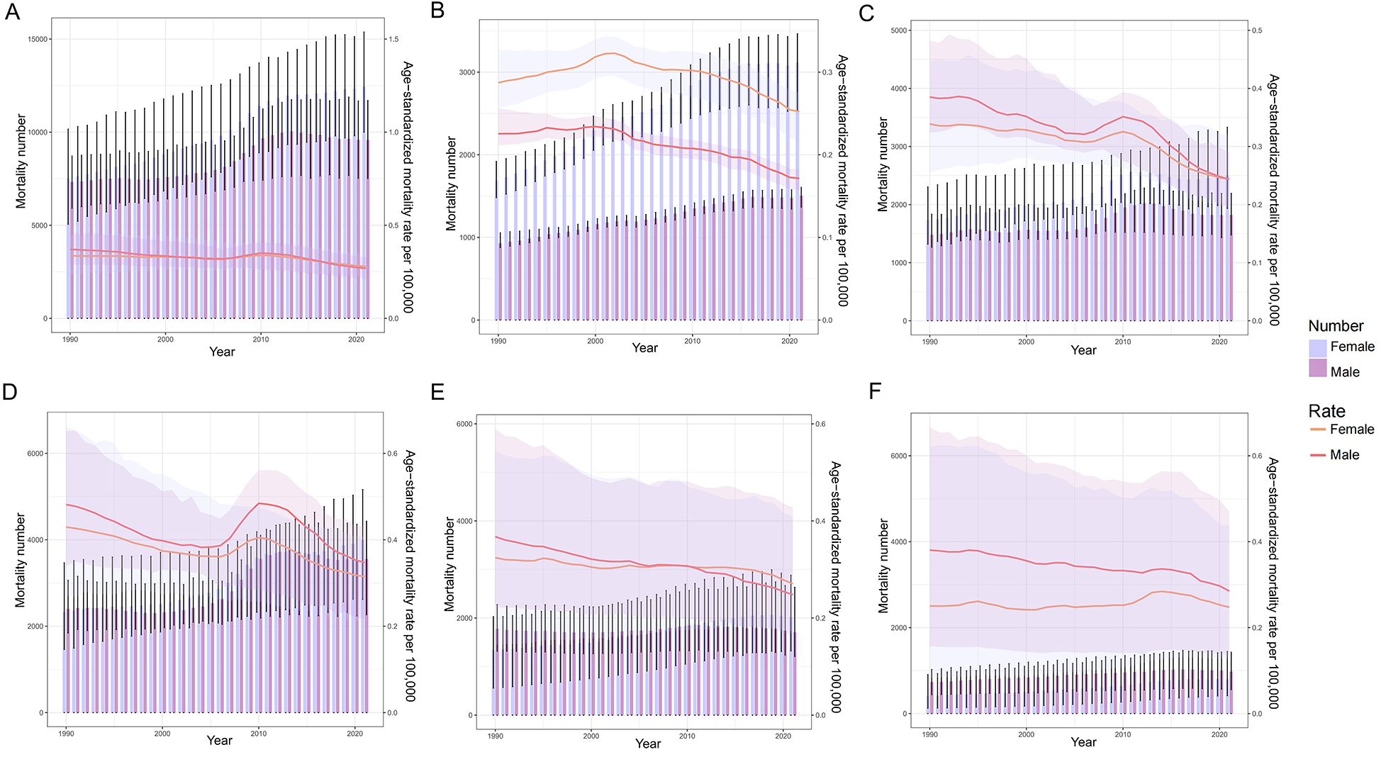 Trend in mortality number and ASMR of PAH. (A) The global trend in mortality number and ASMR of PAH from 1990 to 2021; (B) The trend in mortality number and ASMR of PAH in the high SDI region from 1990 to 2021; (C) The trend in mortality number and ASMR of PAH in the high-middle SDI region from 1990 to 2021; (D) The trend in mortality number and ASMR of PAH in the middle SDI region from 1990 to 2021; (E) The trend in mortality number and ASMR of PAH in the low-middle SDI region from 1990 to 2021; (F) The trend in mortality number and ASMR of PAH in the low SDI region from 1990 to 2021. ASMR, age-standardized mortality rate; PAH, pulmonary arterial hypertension; SDI, sociodemographic index.