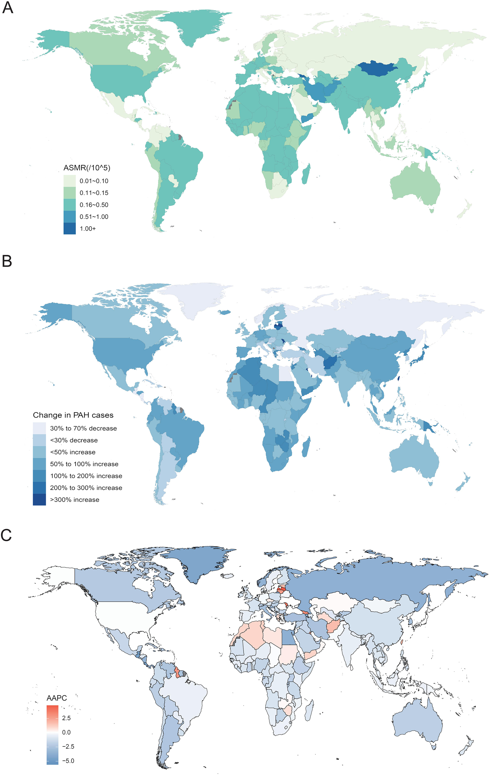 ASMR, relative change in case number of mortality and AAPC of PAH. (A) The ASMR of PAH in 2021; (B) The relative change in case number of mortality of PAH from 1990 to 2021; (C) The AAPC of ASMR of PAH from 1990 to 2021. ASMR, age-standardized mortality rate; PAH, pulmonary arterial hypertension; AAPC, average annual percentage change.