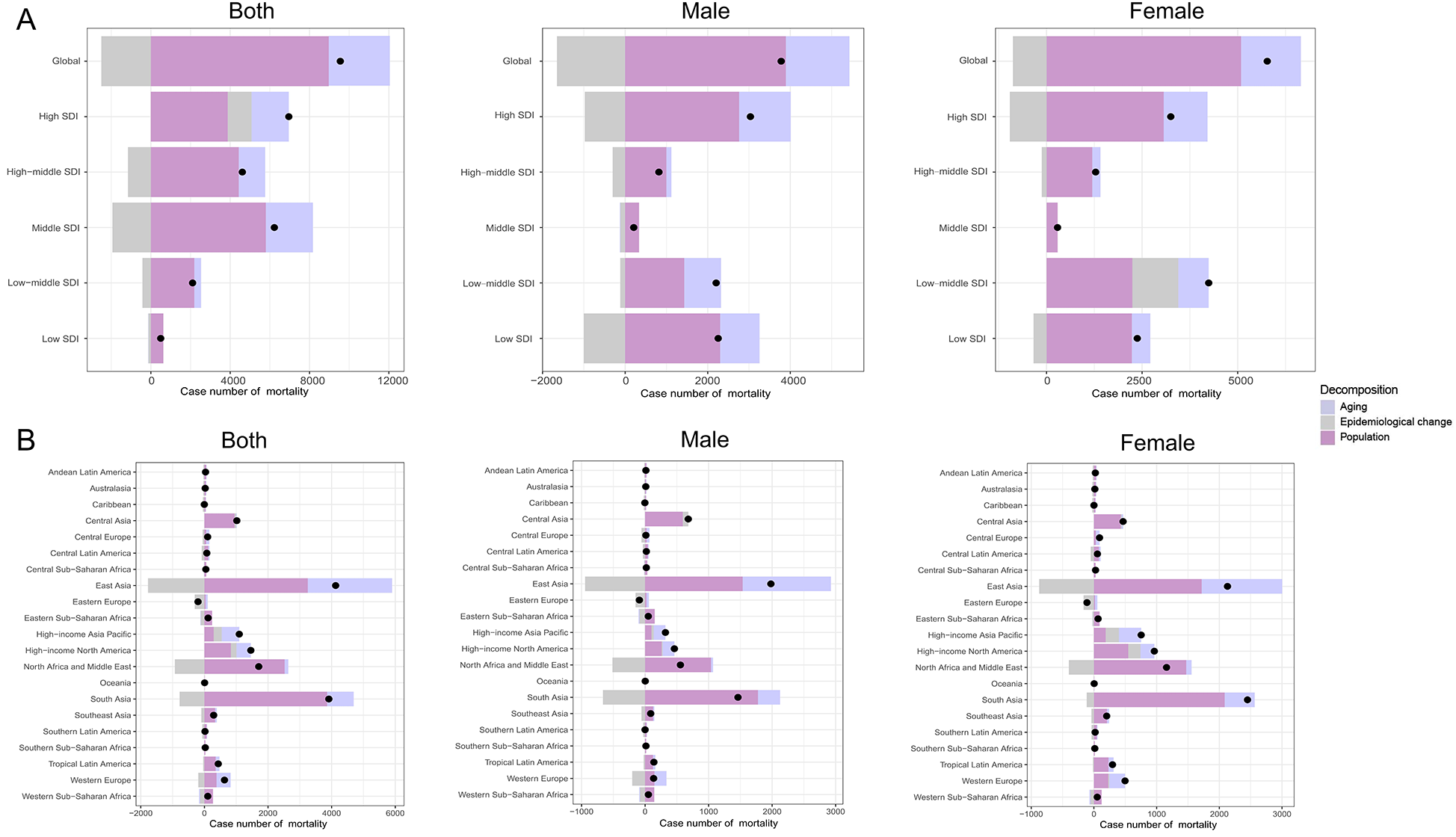 To gain a better understanding of explanatory factors that drove change in PAH mortality between 1990 and 2021, we performed a decomposition analysis of the case number by population size, age structure, and epidemiologic changes. Epidemiological changes refer to the underlying age and population-adjusted mortality and morbidity rates (10).