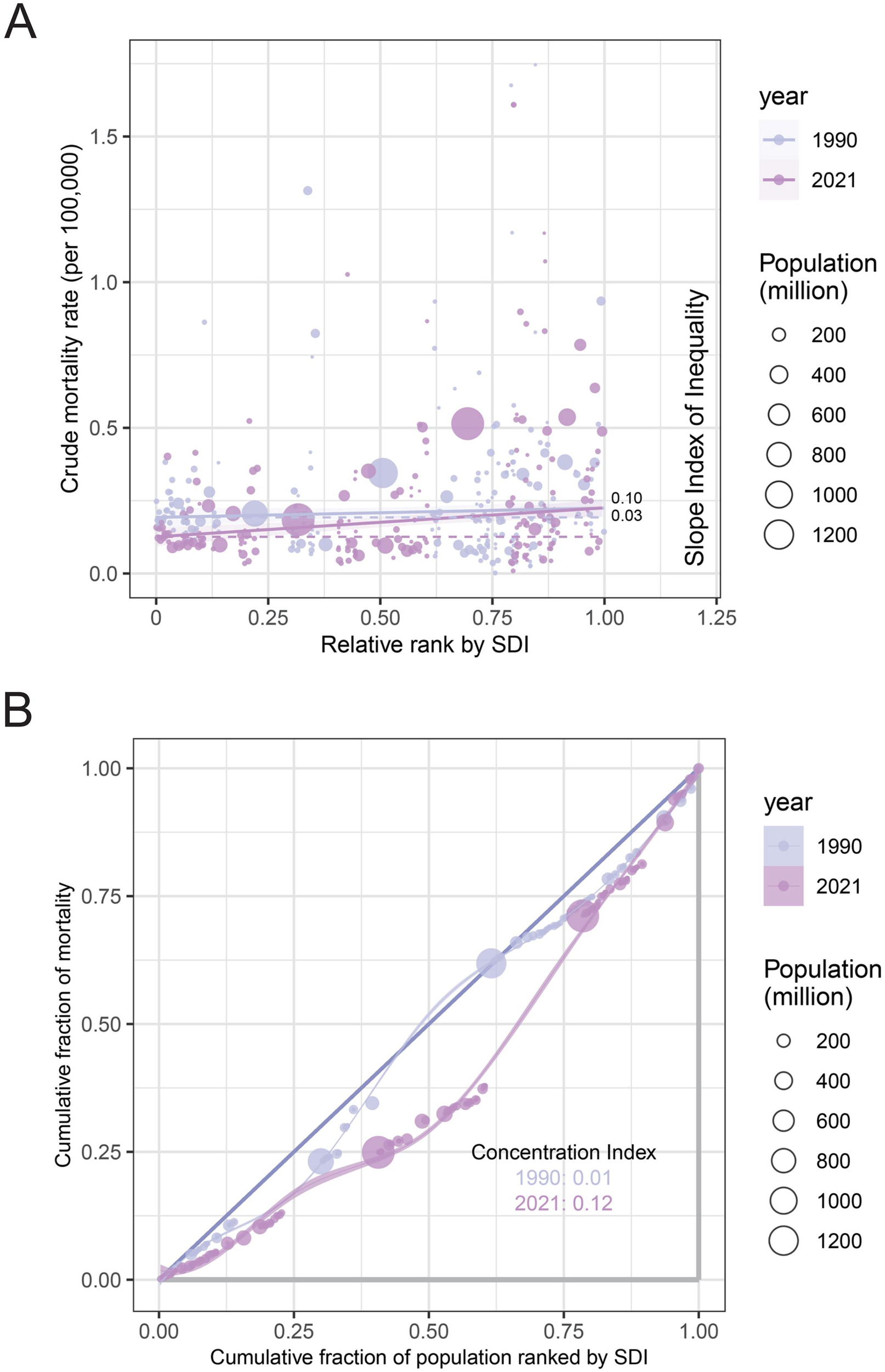 The total mortality rate was extracted for inequality analysis. Slope of inequality index (SII) and the concentration index (CI) were used to assess absolute and relative income-related inequalities across countries (10, 11). The SII was calculated by regression of the country-level mortality due to PAH in all age populations on the sociodemographic development-related relative position scale, defined by the midpoint of the cumulative class range of the population ranked by SDI. The CI is utilized to assess the relative disparity in the burden of PAH among countries by fitting the Lorenz concentration curve based on cumulative mortality and cumulative population (12).