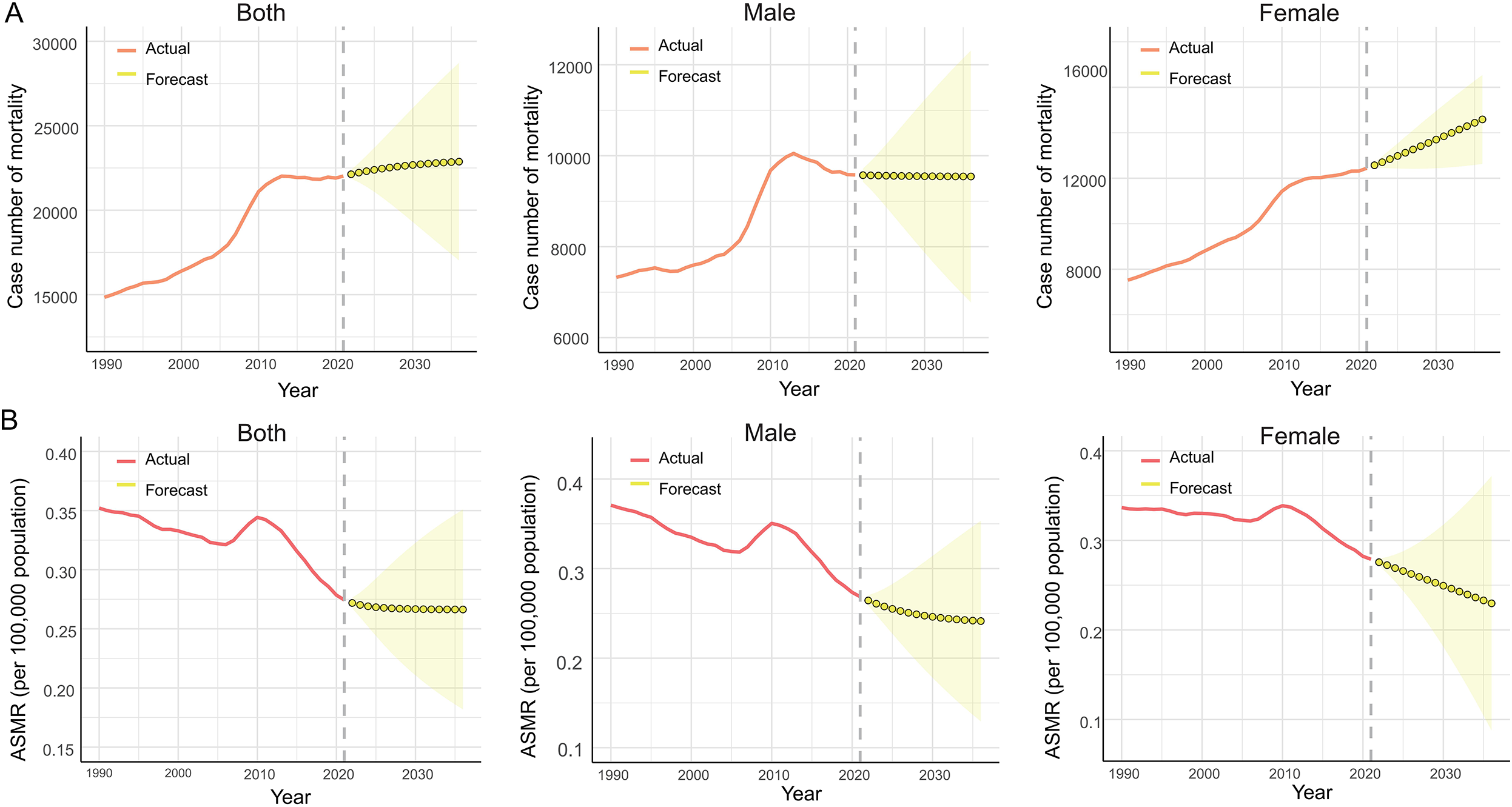 The number of deaths and age-standardized rate (ASR) of PAH from 1990 to 2021, by sex, region, and country, were extracted from the Global Health Data Exchange query tool (https://vizhub.healthdata.org/gbd-results/). Specifically, we chose “Cause” as “Pulmonary Arterial Hypertension”, “Measure” as “Deaths”, “Metric” as “Number” and “Rate” to obtain the mortality data across 204 countries and territories all over the world, with a search period from 1990 to 2021. Related forecast statistics on the world population from 2020 to 2036 were sourced from the GBD database (https://www.ghdx.healthdata.org/record/ihme-data/global-population-forecasts-2017-2100).