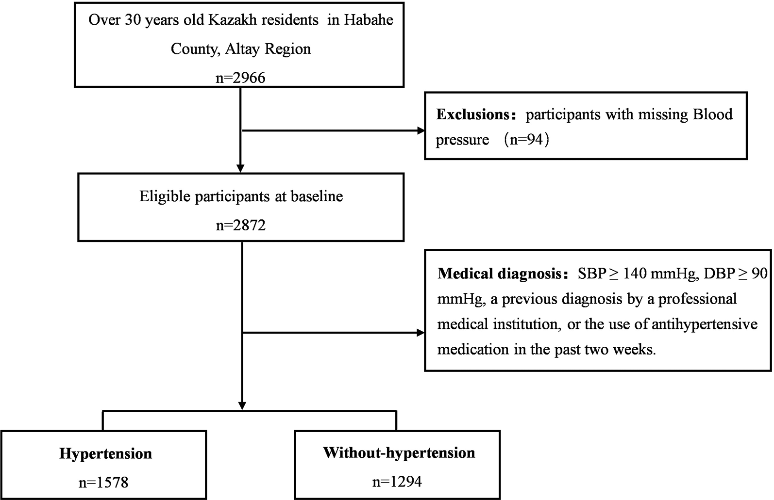 Hypertension was defined based on systolic blood pressure (SBP) ≥140 mmHg, or diastolic blood pressure (DBP) ≥90 mmHg, or a previous diagnosis by a professional medical institution, or the use of antihypertensive medication in the past 2 weeks (33, 34).